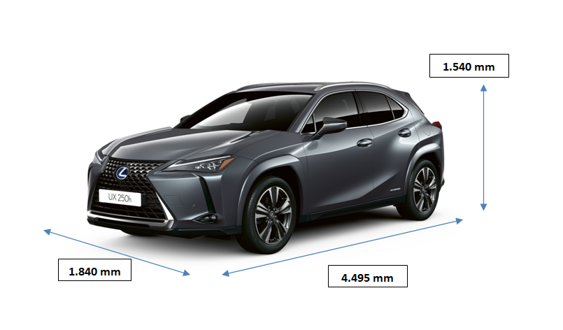El Lexus UX, como ya hemos mencionado, es un crossover ubicado dentro del segmento C. Su longitud es de 4.495 mm, mide 1.540 mm de alto y tiene una anchura de 1.840 mm.